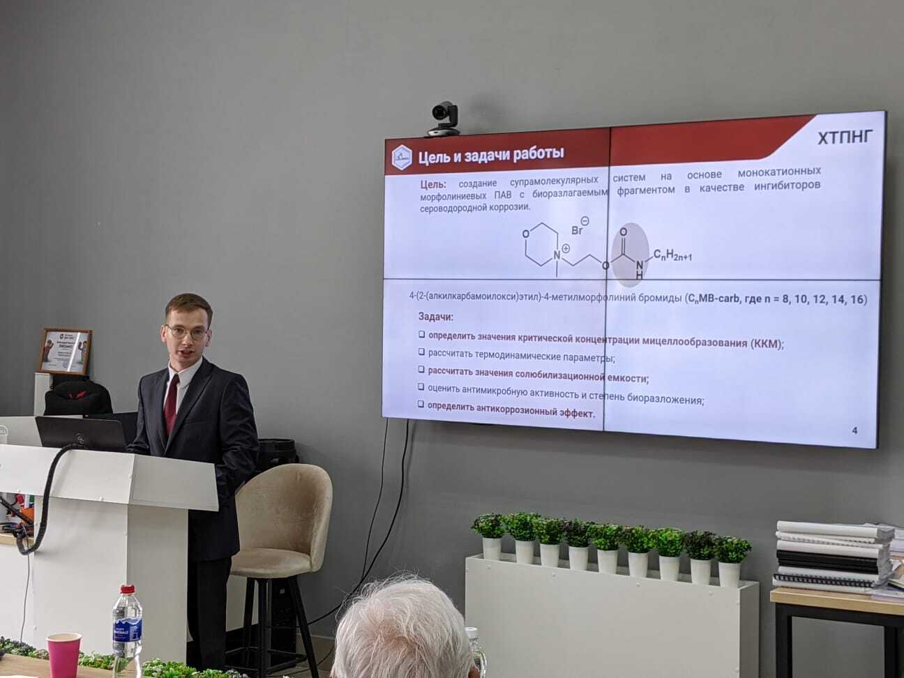 Александр создал новые монокатионные морфолиниевые ПАВ с карбаматным (биоразлагаемым) фрагментом, исследовал их свойства (солюбилизирующая способность, критическая концентрация мицеллообразования, биоразлагаемость, антимикробные свойства), а для наиболее удачного гомолога провёл испытания в условиях сероводородной коррозии с помощью гравиметрического метода.